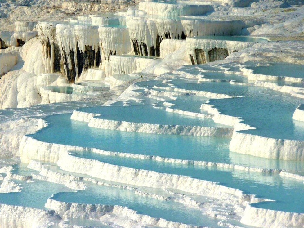 Das heiße, kalkhaltige Thermalwasser aus den hier befindlichen Quellen verdunstete und hinterließ so in tausenden von Jahren diese unglaublichen Kalkablagerungen. Dieser Naturschatz wurde 1988 von der UNESCO zum Weltkulturerbe erklärt. Jedoch fand kurz danach ein Touristenansturm statt der drohte, diese Naturschönheit zu zerstören. Hotels wurden in unmittelbarer Nähe gebaut und das heilende Thermalwasser zu eigenen Zwecken vermarktet. Man sah die Gefahr und Vertreter der Tourismuspolitik reagierten schnell. Die Schönheit von Pamukkale mit seinen ehemals schneeweißen Kalkterassen sollte wiederhergestellt werden. Die Hotels wurde abgerissen und das Baden in den Sinterterrassen wurde verboten.
